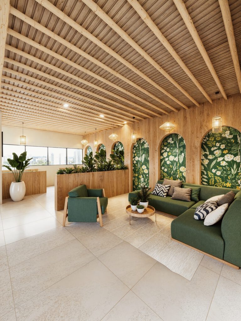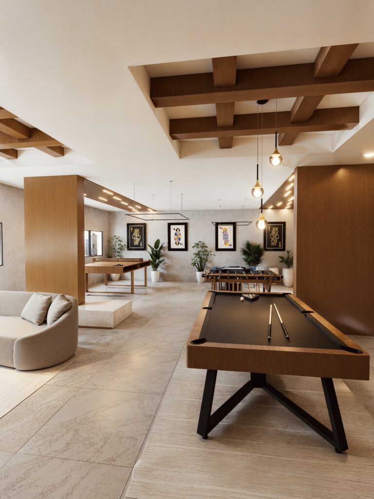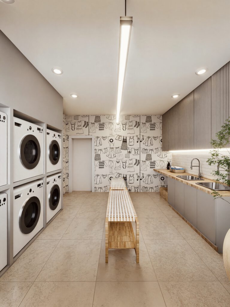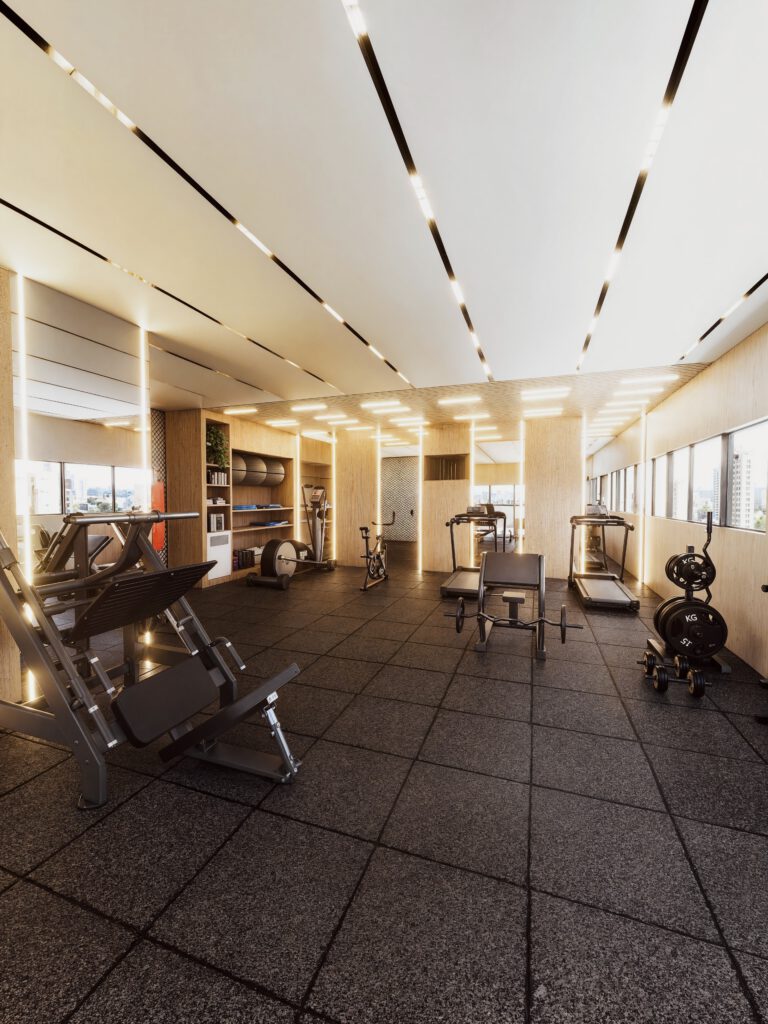 Espaço Mini Mercado, Fitness e Pilates, Lavanderia, Salão de Festas com Café, Salão de Jogos, Coworking, Brinquedoteca, Administração, Refeitório e Área de Descanso, Vestiários, Piscina, Bar, Espaços Gourmet com Churrasqueira e Sauna.